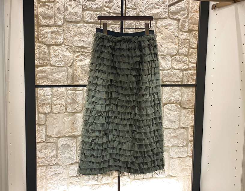 メッシュフリルを重ねた甘さのあるアイラインスカート。落ち着いたカラーでモードにも取り入れやすいです。