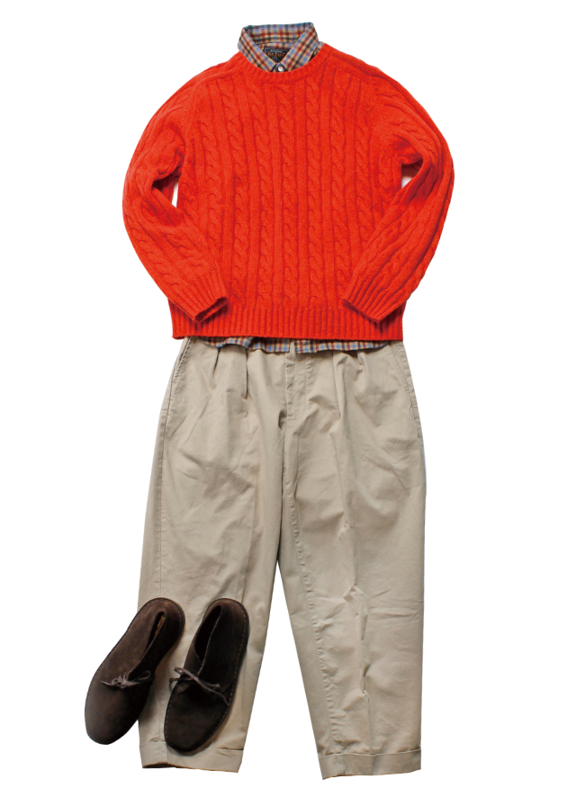 ケーブル編みのクルーニットはメリノ種の子羊から刈り取られたラムズウールを使用。繊維が細く柔らかく、肌触りが良い点が特徴です。吸湿性と放湿性が高く、軽くてシワになりにくいのも魅力。鮮やかな発色で冬コーデの主役にぴったり。チェックシャツは1960年代アメリカのボタンダウンシャツがベース。全工程を国内の熟練職人の手で仕上げています。両脇裾部分のカン留めもポイント。ジャストサイズのトップスに対し、立体的なシルエットでゆとりをもたせたパンツ、スエードのシンプルなシューズを合わせて全身をバランス良く。