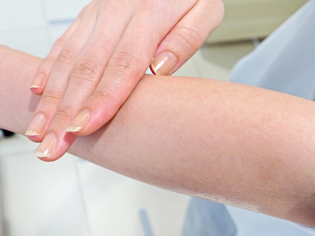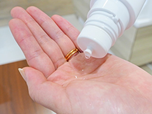 指の腹を使って頭皮をくるくる円を描くようにやさしくマッサージ(写真は頭皮の代わりに手の甲で行っています)。2、3分置いたらぬるま湯で流してシャンプー、トリートメントといつも通りのケアを行いましょう。頭皮の状態に合わせて週2回程度のケアがおすすめです。