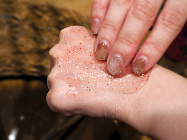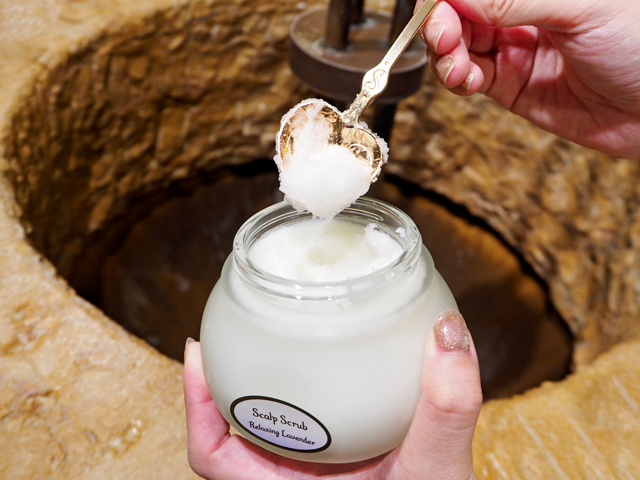 ヘッドスクラブはシャンプーの前に使います。まずは髪全体を予洗いし、スプーン1杯ほどのスクラブを取って、頭皮によく馴染ませましょう。
