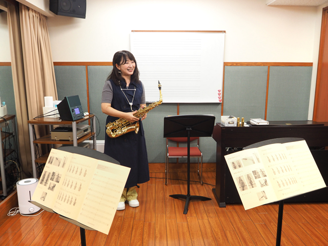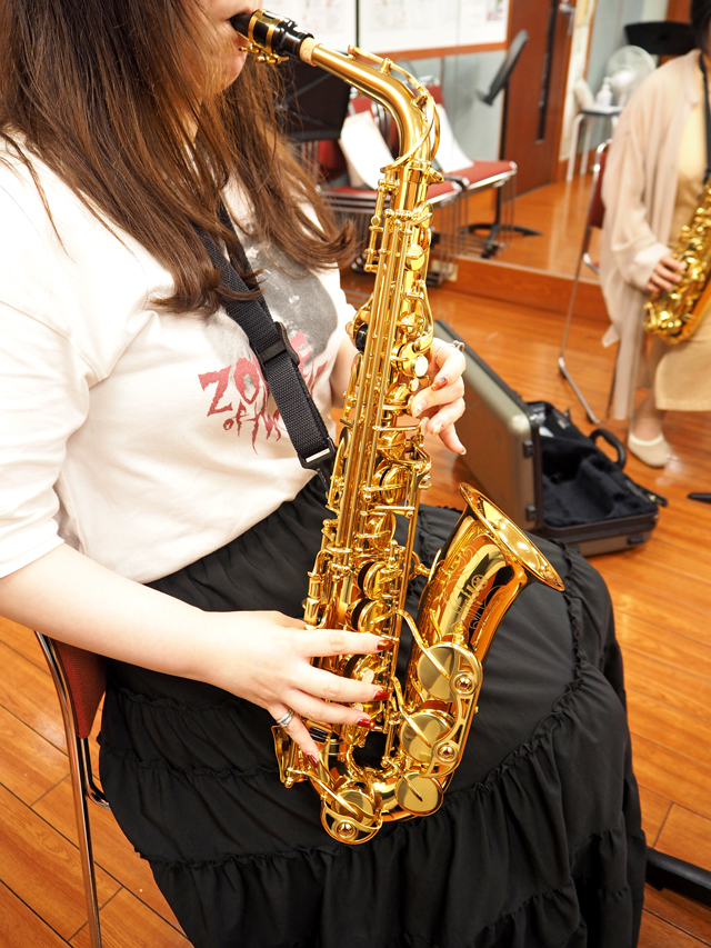取材日にサックスを教えていただいたのですが、吹いたことも触ったこともない初心者ながら、少し習っただけで音が出るようになって感動!