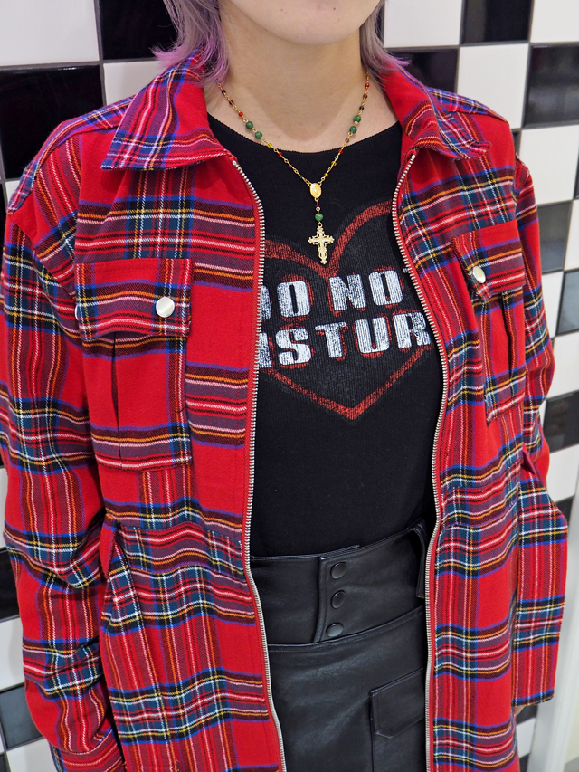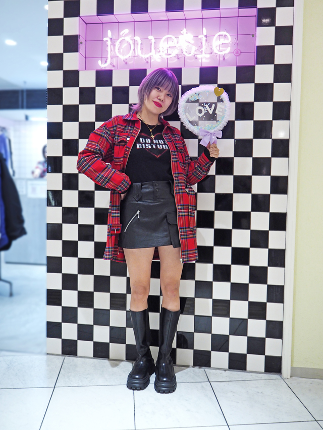 ライブ参戦時には、厚底で身長を盛りつつ、動きやすさとほどよく目立つアイテムを取り入れてスタイリングするのが◎。「ジュエティ」が提案するのは、チェックのワンピースが印象的なコーデ。レザー風のボトムスは、スカパンだからたくさん動くライブ時にも問題なし。ブラック×レッドのカラーリングはシックかつ目立ちやすく、推しに見つけてもらいやすいかも!