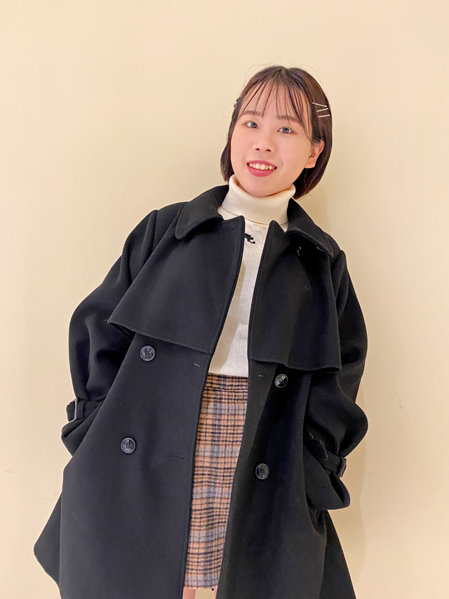 端正な印象のコートはシンプルに着てもおしゃれ見え確実。襟を立てればスタンドカラーにもでき、マフラーなしでも暖かいです。ミニ丈が苦手な方や大人っぽいコーデが好きな方はウエストを絞ってロングスカートやロングワンピと合わせるとGOOD。