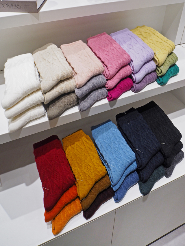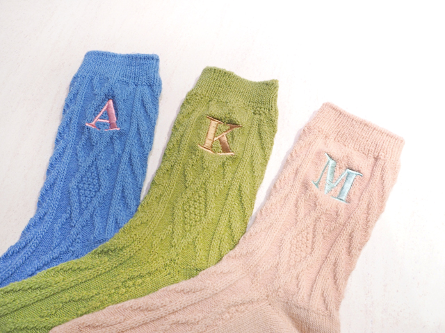 毛混ダイヤケーブルソックス 各990円(刺繍は別途110円)