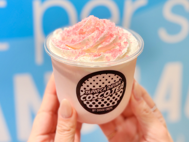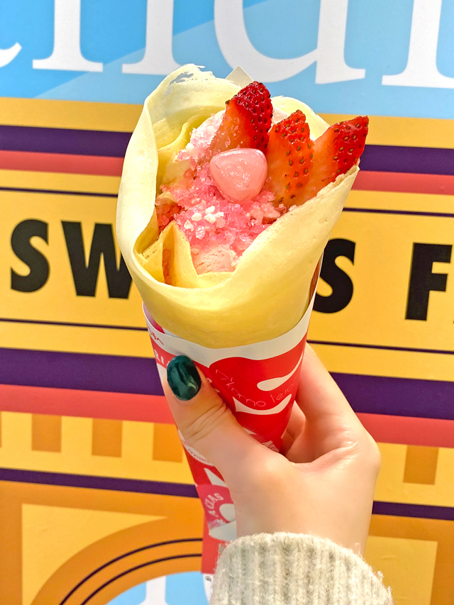 イートインスペースがあり、移動中やイベント前後に立ち寄りやすい「コスコスイーツファクトリー」。こちらのクレープはもっちり食感の生地にいちごアイスやいちごみるくキャンディがたっぷり。写真映えも抜群なので、ぬい撮りにもぴったりです。