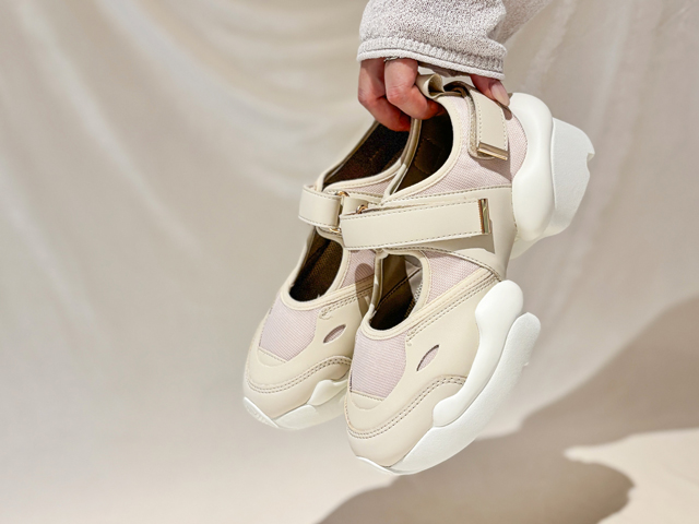 立ちっぱなしや歩きが多いライブやイベントではスニーカーになりがちですが、せっかくならおしゃれしたいもの。こちらのスニーカーサンダルはベルクロで脱ぎ履きが楽ちんで、ぷっくり愛らしいヒール型ソールでスタイルアップも叶います。