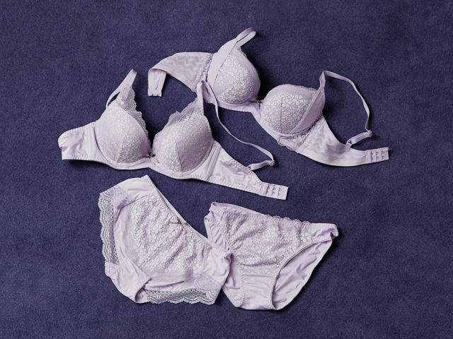 こちらも可愛いカラーとデザインが特別感のあるアイテム。ソフトで軽い花びらの重なりがラインで表現されています。「チャーミングラマー スリムライン DeepV」(写真上)は脇&背中スッキリなデザインでキレイに着こなせるブラ。「チャーミングラマー」(写真下)は痛くなりにくいワイヤーを使用した3/4カップデザインです。