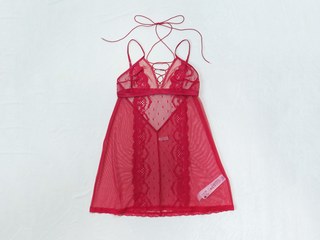 同じシリーズのベビードールは、クリスマスカラーのレッドとレースのディティールが特別な夜にぴったり。ノンワイヤーのトライアングルカップ付きです。センターにあしらった繊細な刺繍やチュールの透け感、デコルテラインでクロスさせて首元で結ぶストリングなど、遊び心いっぱいのアイテム。