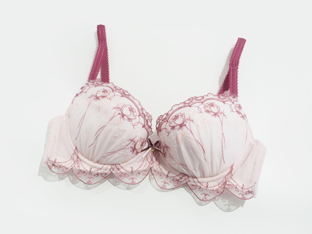 クラシカルなヨーロッパ建築をイメージした繊細でエレガントなデザインが印象的。ブラは5面構造の内蔵パッド入りでカップが浮きにくく、厚みの違うパワークッションがバストを押し上げてデコルテまわりをしっかりとボリュームアップします。