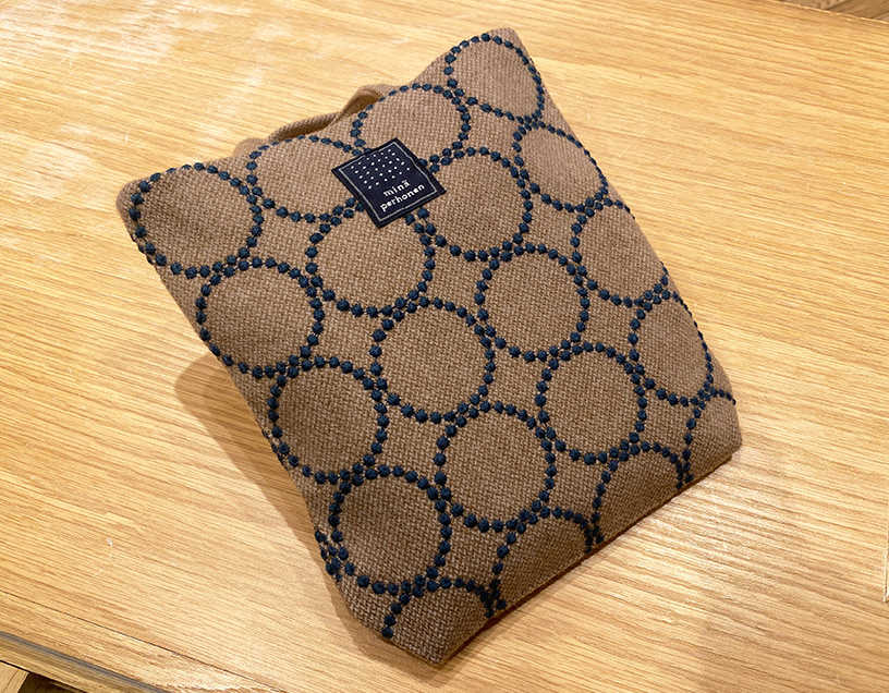 「tambourine」のテキスタイルを使用したトートバックです。ちょっとしたお出かけに最適なサイズで、ポーチやサブバックとしてもご活用いただけます♪