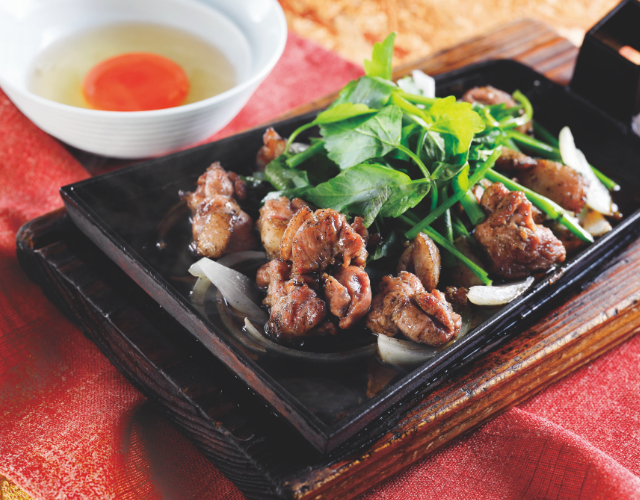 備長炭で炙った新鮮な河内の合鴨に特製の割下をかければ、熱々の鉄板から食欲をそそる香りが。卵につけてすきやき風に召し上がれ。1978年に創業した大阪・八尾の「とり福」以来つぎ足してきた秘伝のタレと、内モンゴル地方の天然塩で焼き上げる焼き鳥串にも注目。