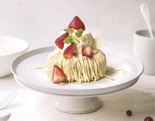 3枚重ねたふわふわパンケーキに、チーズクリームを贅沢にあしらった真っ白なパンケーキ。大粒のいちごと、別添えのベリーソースの酸味が味のアクセントに。クリスマス限定、ミオ限定の味なので見逃さないで。