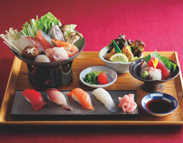 旬の魚と日本酒を豊富に楽しめるお店、京月の冬のおすすめは、あったか海鮮小鍋とお寿司のセット。刺身とからあげも付いた大満足メニューです。おひとり様でもご夫婦でも、お昼でも夜でもおいしく食べられ、体が温まります。そのほか、寒い時期にはてっさやてっちり小鍋が旬。お店の人気メニュー、鯛のかぶと煮もお忘れなく。
