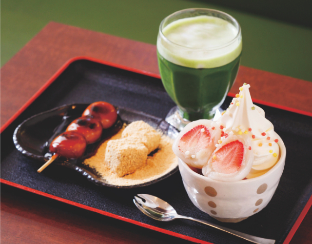 気軽にくつろげる“和かわいい”カフェに、天王寺ミオ限定いちご大福セットが登場!いちご大福が乗ったクリームたっぷりのパフェに、看板商品のみたらし団子、わらびもち、選べるドリンクが付いた、和スイーツ好きにはたまらない欲張りセット。