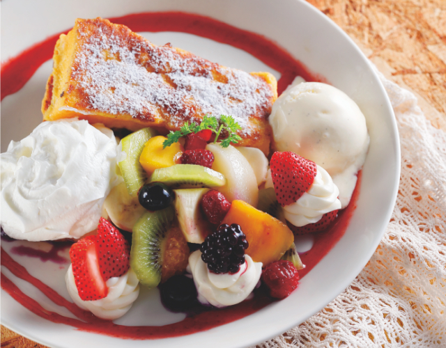 たくさんのフルーツとレアチーズクリームを贅沢に添えた、しっとり柔らかなフレンチトースト。思わず写真に収めたくなるカラフルな華やかさも魅力的。贅沢ブランチやちょっとひと息つきたいティータイムにどうぞ。