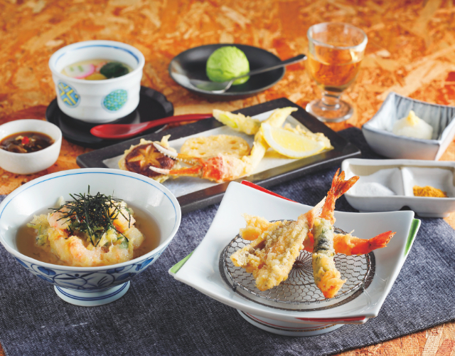 特製ブレンドのごま油を使ってカラッと揚げた7品の天ぷらと、ミニサイズの天茶または天丼が味わえるコース。東京銀座の本店と同じように、目の前で揚がった熱々の天ぷらをひとつひとつ席まで運ぶスタイルです。旬の素材の美味しさを存分に堪能して。