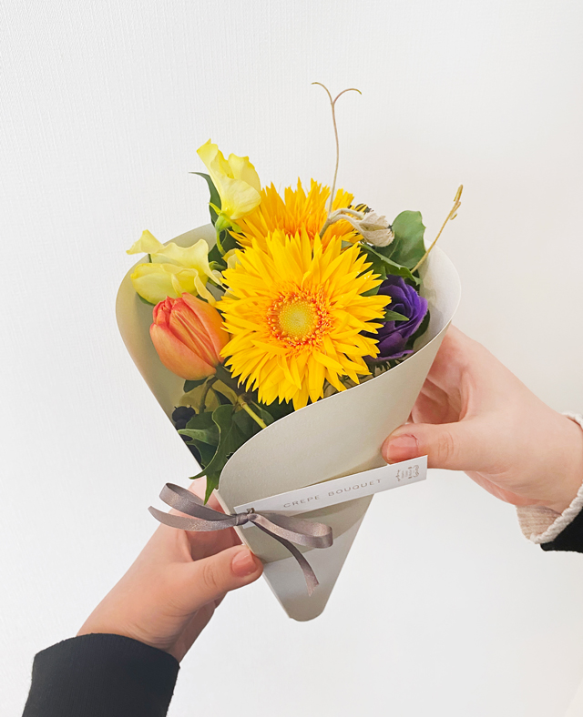 花瓶を持っていなくても飾れる、「青山フラワーマーケット」のオリジナルブーケ。水入りカップのキリトリ線に沿って切り離すとそのまま飾れて、手軽に美しい花を楽しめます。会社の送別会や特別な日のギフトとして、相手を選ばずおすすめです!