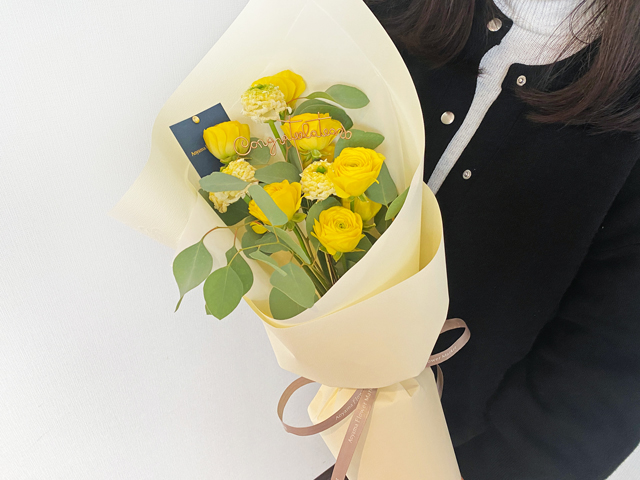「あなたは魅力的」の花言葉を持つラナンキュラスのブーケ。1本に約100枚の花びらを持つ華やかなラナンキュラスは、飾ったあとも大きく咲き誇り、新たな門出を後押ししてくれているかのよう。お祝いの気持ちを込めた“Congratulations”のピックも◎。
