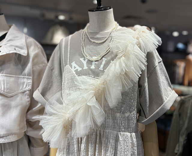 トレンドのチュールでできた軽やかなストール?わざとねじってフリルを立たるのもふわふわ感が増して素敵です。