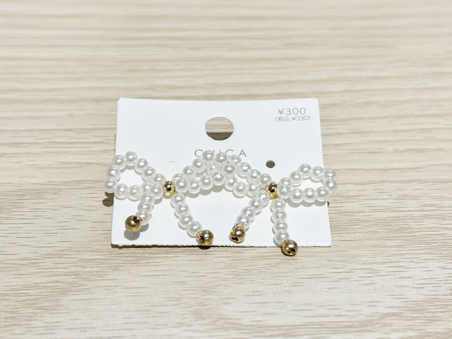 耳元をパールとゴールドの上品なデザインに可愛らしいリボン形のピアス。