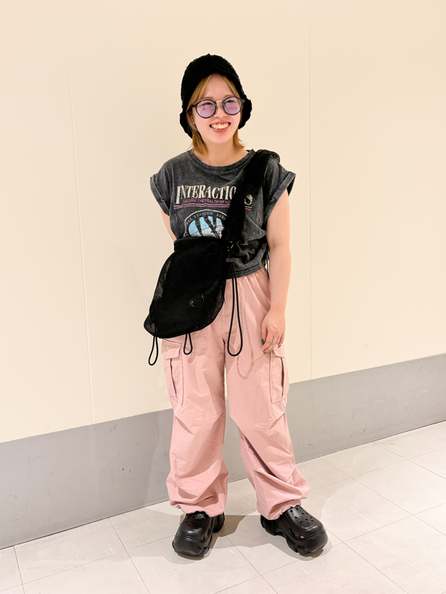 大人気のパラシュートカーゴパンツをメインに、ヴィンテージライクなTシャツを合わせれば、今どき感たっぷり。ピンクとブラックでクールな夏フェス女子を目指して。