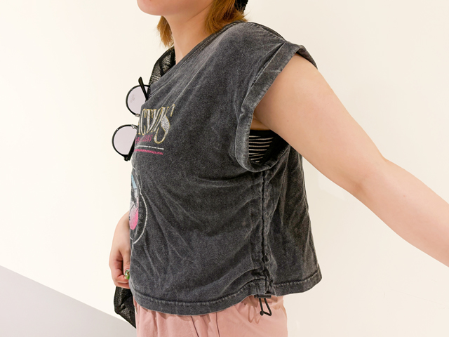 Tシャツのサイドはドロスト仕様に。絞ってインナーを見せたり絞らずにTシャツとして着たりとバリエが楽しめるのもうれしいです。