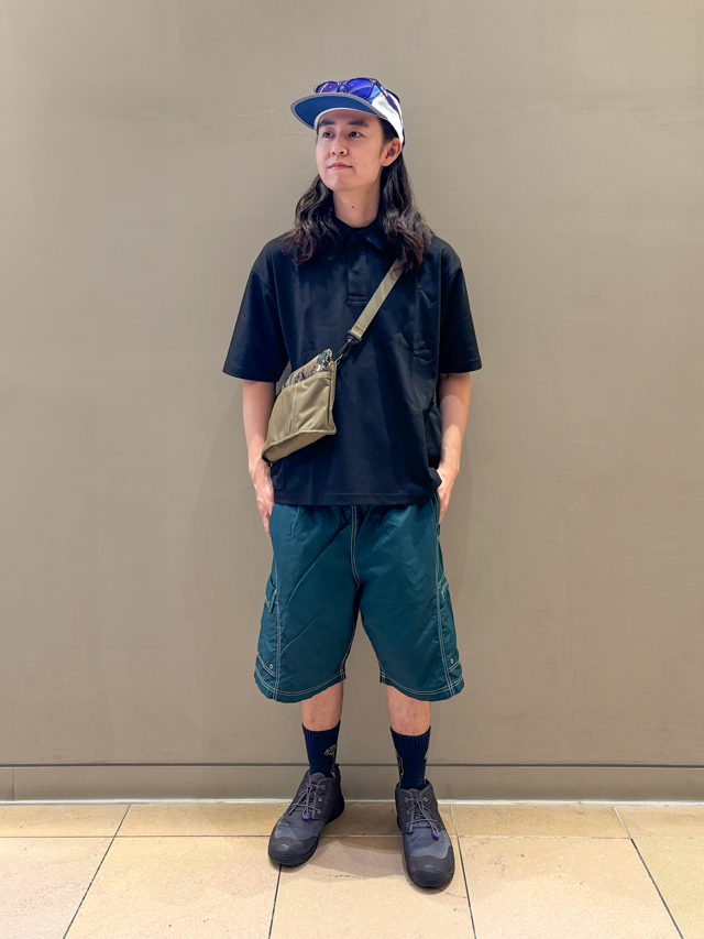 トレンドの長めショーツと速乾性のポロシャツで、おしゃれ感と快適性をしっかり両立。ポケット付きのポロシャツ&ショルダーバッグでシンプルになりすぎず、キャップとサングラスでフェス映えもばっちり。