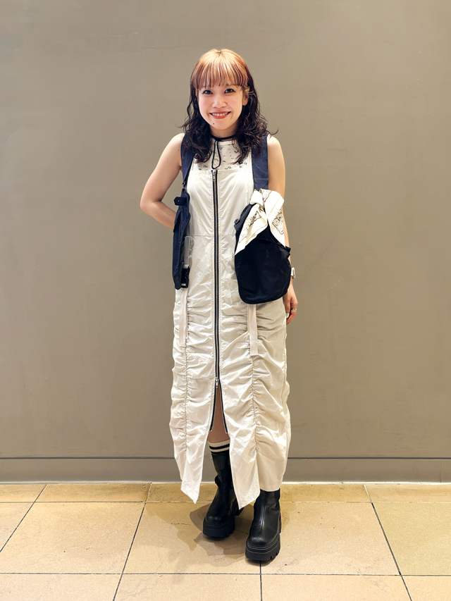 ノースリーブ&汗染みが目立ちにくいホワイトをメインに、暑いフェスも軽やかに乗り切れるレイヤードコーデ。動きやすく洗濯もしやすいワンピに、SNSで話題のハンティングベストをオン。