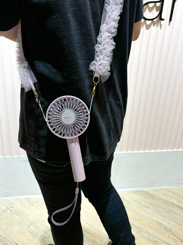 毎年大人気のハンディファン。風量を5段階調節できたり最大9時間使えたりと、さまざまなシーンで重宝します。フェスにぴったりなビタミンカラーやキラキラデザインもあり。