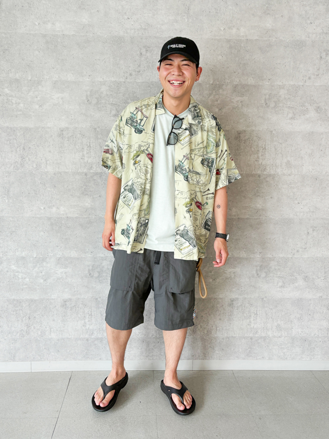 フェス映えするアロハシャツに撥水ナイロンのショーツを合わせて、おしゃれ感と快適性をしっかり両立。足元はリカバリーサンダル「ウーフォス」で、悪路でも動きやすく!