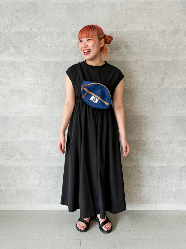 発売以来大人気の、オリジナル撥水加工素材ワンピース。雨や汗に強く、縦にも横にも柔軟に伸びる素材は、たくさん歩くフェスにうってつけです。バッグにブルーを取り入れて、ほどよくアクセントをきかせて。