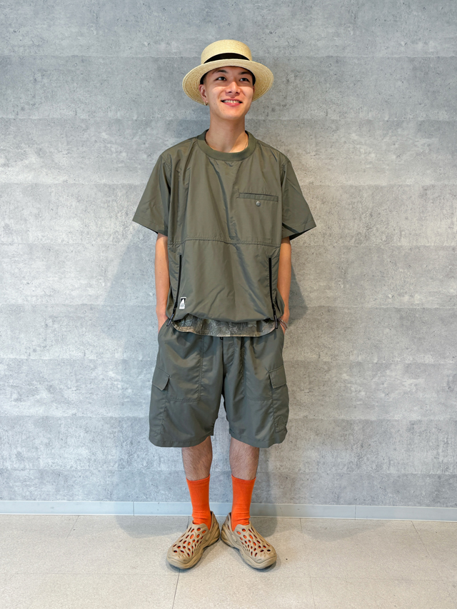撥水ナイロンのTシャツとカーゴショーツを同色で合わせつつ、オレンジのソックスでアクセントをプラス。軽くて履き心地がよく、テック感も魅力のハイドロ モックで、足元まで抜かりなし!