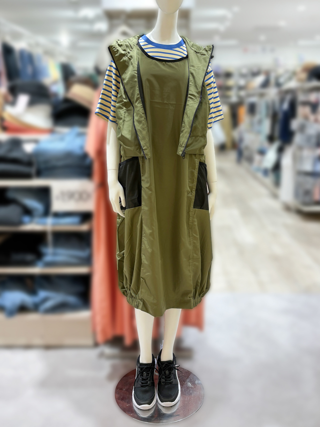 ベストには大きめのポケット付き。気になる胸元やおなか周りも隠せて、着映え感もあります。さらっと着るだけで丸みがでるコクーンシルエットのワンピも技あり!