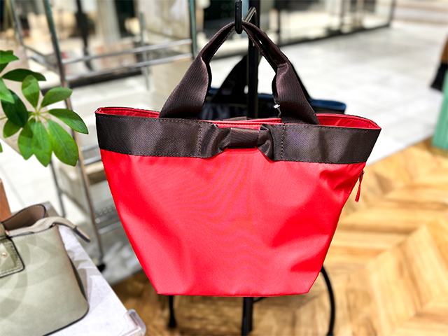 撥水効果があり、さり気なく施されたリボンがかわいいバック。内側にはポケットがついており、側面にもファスナーがついていて、物が取り出しやすい構造になっています!