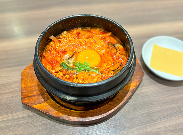 辛さは5段階から選べるピリ辛ベースのスープにもちもちのサリ麺と豆腐をたっぷり加えて煮込んだラーメンスンドゥブ。