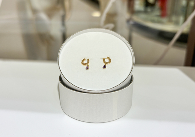 アメジストとホースシューの組み合わせが魅力的な印象を与えてくれるピアス。ヨーロッパでは、U字型の馬蹄(ホースシュー)は古くから幸運の象徴とされており、シンプルなデザインが耳元をきれいに見せてくれます。
