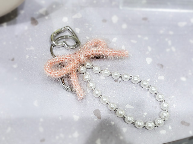ニット素材のリボンとハートのカラビナがかわいいチャーム。