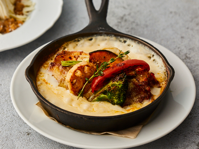 クアトロフォルマッジドリアは、4種のチーズどグリルチキンのうまみが絡み合うスペシャルメニュー。フレッシュなモッツァレラや濃厚な風味と塩味が魅力のゴルゴンゾーラ、ナッツを思わせる香りとまろやかな味わいのラクレットにパルメザンチーズをかけた、チーズの個性を楽しむこだわりの一皿です。
