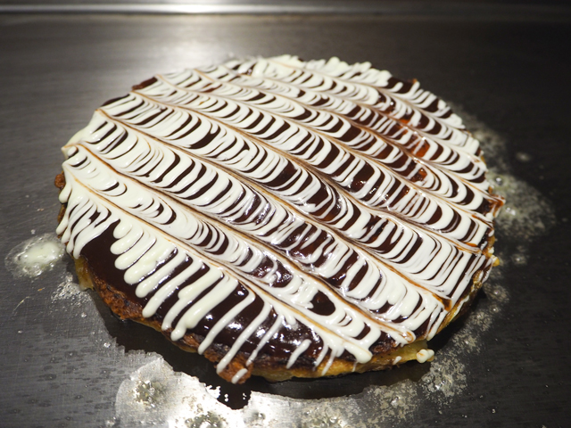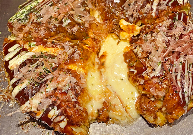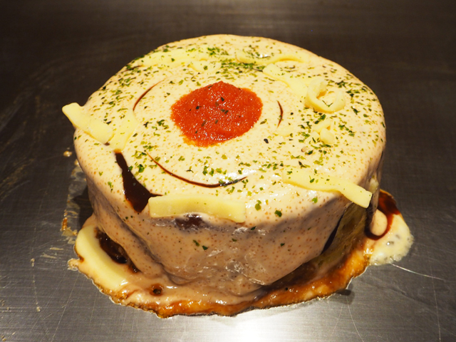 生地の中にチーズを混ぜ込み、さらに表面にもチーズをトッピングした豚玉チーズダブル。鉄板で焼き上げたチーズでカリカリ・パリパリの食感が楽しめます。焼きたてを頬張れば、口の中でじわっと広がるチーズの味わいが格別。鉄板で焼き上がりを待つ間に会話も弾むので、気軽なデートや女子会など幅広いシーンにおすすめです♪