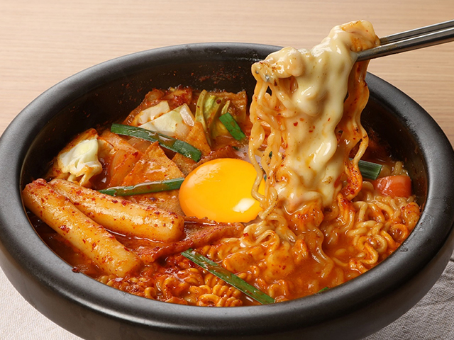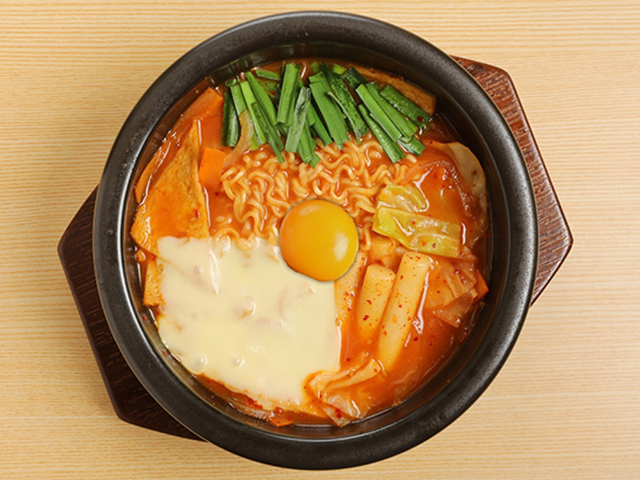 寒い季節にうれしいチーズラッポギも見逃せないメニュー。「ラーメン+トッポギ」を意味するラッポギは、サリ麺(インスタントラーメン)とトッポギを煮込んだ韓国で人気の屋台グルメです。こちらのメニューではスライスチーズをトッピングし、さらに満足感の高い1杯に♪辛味のきいた濃厚スープに麺と弾力のあるトッポギが絡み合い、とろけるチーズがまろやかさを添えています。