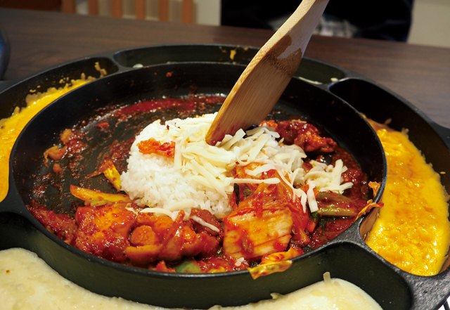 具材に火が通り、真ん中のチーズがとろけてきたらいい頃合い♪チーズの海に具材を浸していただきましょう。ピリ辛なソースがチーズでほどよくまろやかになり、ご飯にもお酒にも合うおいしさに。シメに「ポックンパ(500円)」をオーダーすれば、残った具材と混ぜ合わせておいしい炒めご飯にしてもらえます♪