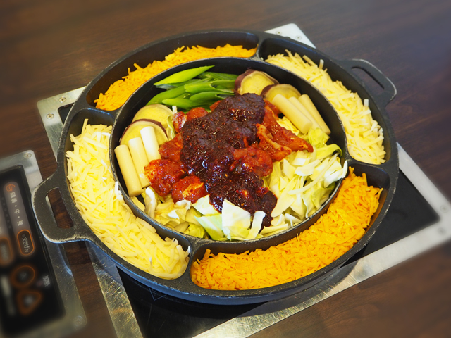 モッツァレラベースのまろやかチーズと、チェダーベースのガツンとコクのあるチーズ、どちらも楽しめるのがうれしいですね♪鶏もも肉のほか、ねぎやさつまいも、トックなど具沢山で、おなかいっぱいになれます。