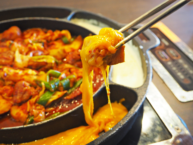 薬食同源をテーマに韓国家庭料理を提供する「コリアン キッチン シジャン」は、チーズ好きにとってもうれしいお店。コチュジャンベースの自家製甘辛だれに漬け込んだ鶏もも肉を、2種類のチーズに絡めていただく「タッカルビチーズフォンデュ」は、思う存分チーズが楽しめるとあって大人気!