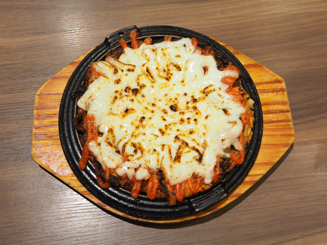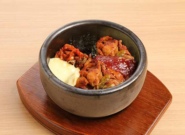 自家製の甘辛ダレで鶏もも肉とたっぷりの野菜を煮込んだタッカルビを、熱々の石焼ピビンバの上にトッピング!モッツァレラチーズベースのとろとろソースとともにしっかりかき混ぜ、ハフハフいただきましょう♪食べ進めるごとにおこげもでき、カリッとした食感がプラス。チーズを2倍にできるWチーズ(130円)で、さらにチーズを堪能するのも◎。