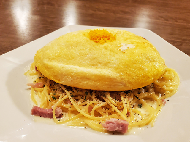 ボリュームたっぷりですが後口はさっぱりなので、ぺろりと食べられるのもうれしいポイント。オムレツは、カルボナーラと混ぜてもコクがプラスされておすすめです。たくさん食べたい人はプラス100円でパスタの大盛りも可能!