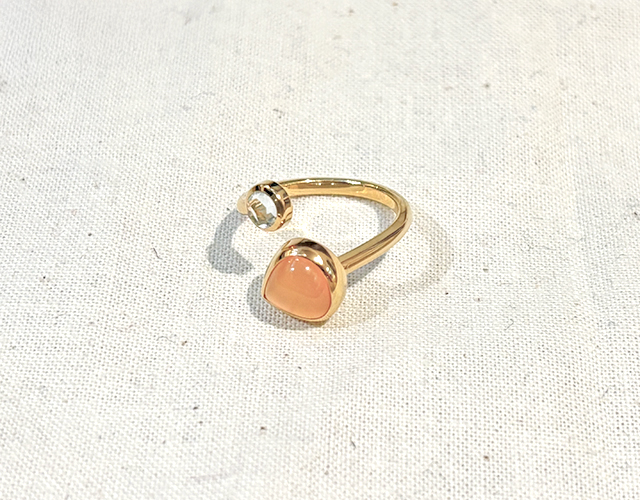 透明感のあるオレンジムーンストーンとホワイトトパーズをあしらったデザインは、優しく柔らかい雰囲気に仕上げてくれます。