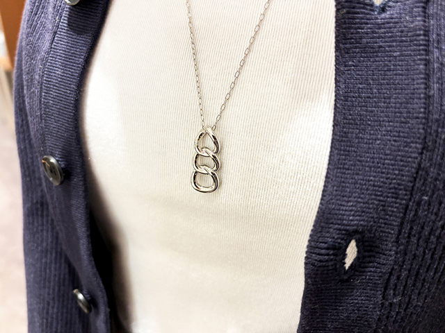 ステートメント ネックレスは長めのシルエットが程よい存在感。