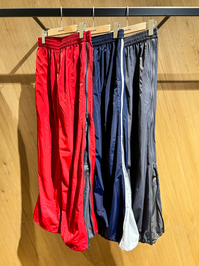 サイドのジップを開けることでシルエットの変化が楽しめるナイロンパンツ。裾のドローコードでボリューム調整ができ、ウエストはゴムで着脱も楽ちんです。滑らかで軽い素材感で暖かい時期まで活躍します。