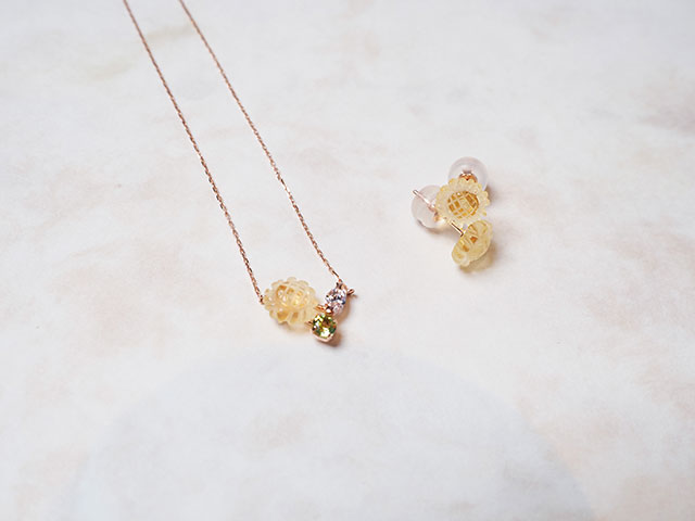 8月の誕生花、ひまわりをモチーフにした愛らしいデザインのネックレスとピアス。誕生花が持つ特別な花言葉のネックレスは、お守りジュエリーとしてご自分へのご褒美や贈り物にもおすすめです。