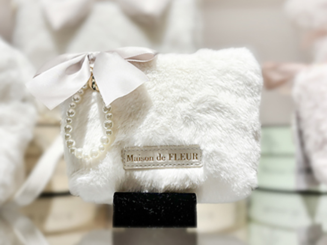 ふわふわのファー素材を使用した、大人可愛いデザインのポーチ。ファスナー部分には、サテンリボンとパールチャームをあしらい、さりげない可愛らしさを添えています。コンパクトながらマチがしっかりあり、リップやミラーなど小物の持ち運びにぴったりなアイテムです。